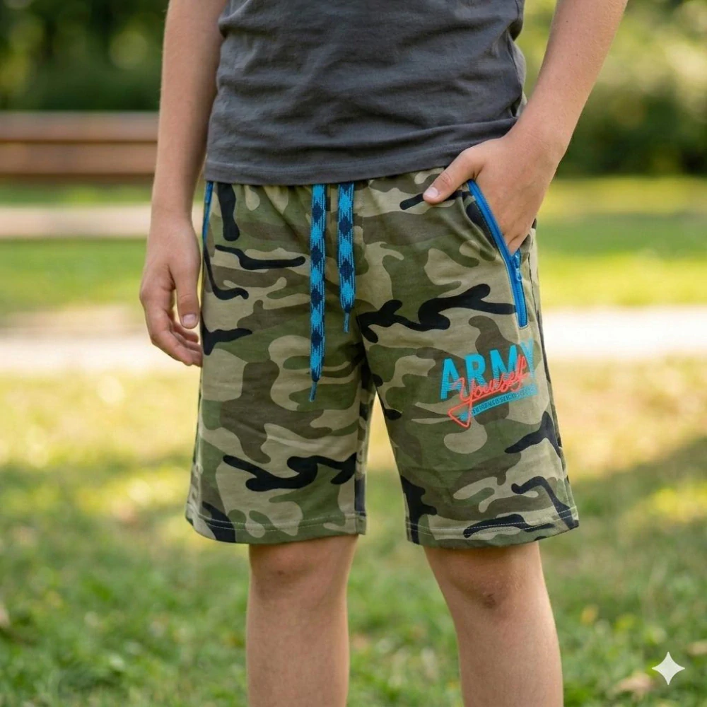 Stylové maskáčové kraťasy pro kluky v junior velikostech 134–164 jsou skvělou volbou pro starší děti, které chtějí pohodlí i moderní army styl. Tyto dětské maskáčové kraťasy v béžovém provedení perfektně doplní letní outfit a hodí se do školy, na hřiště, ven s kamarády i na prázdninové výlety.