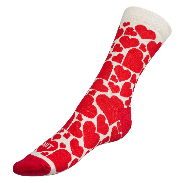 Dámské ponožky se srdíčky. Originalita, pohodlí, styl. Kousek s nápaditým vzorem, který stojí za oživení dámského a pánského outfitu. Jsou vyrobeny z jemné bavlny a díky přidanému elastanu se skvěle přizpůsobí tvaru dětské nohy. Ponožky mají komfortní lemy, které se nezařezávají. Špička a pata ponožek jsou zesílené.