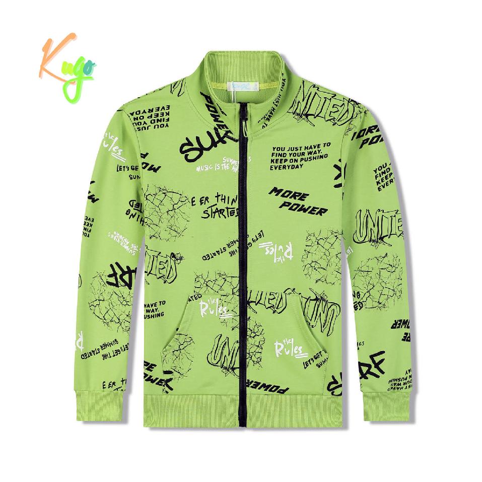 Jednobarevná bavlněná chlapecká mikina Kugo s nápisy vpředu i vzadu. Mikina má zapínání na zip, stojáček, rukávy a spodní díl mikiny jsou ukončené lemem.