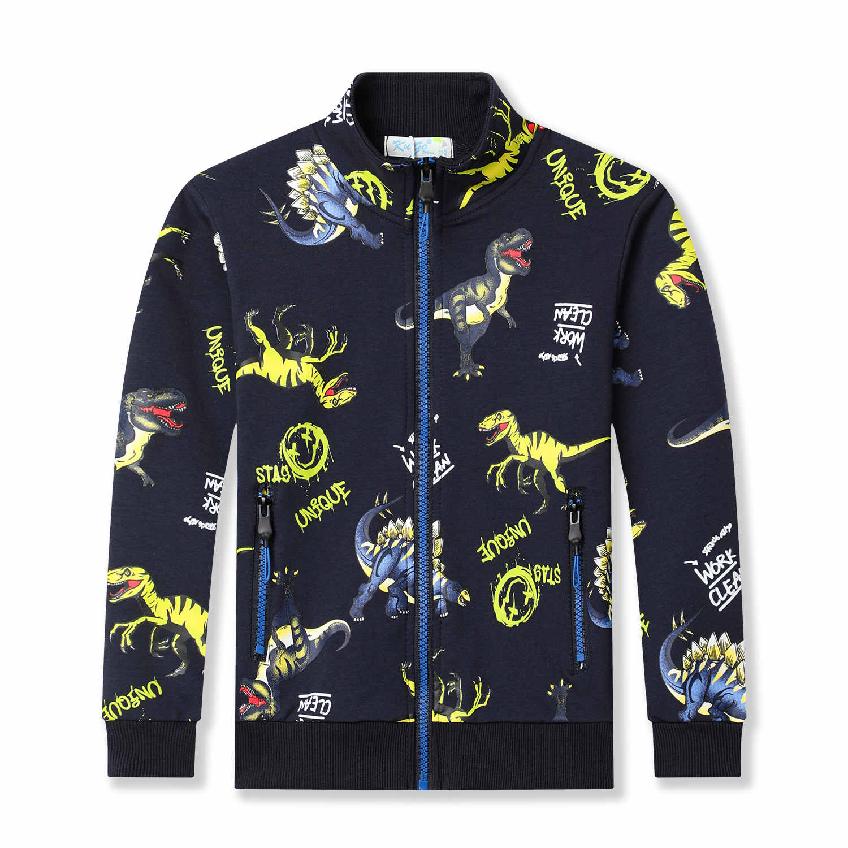 Chlapecká bavlněná mikina s obrázky od firmy Kugo pro všechny malé nadšence dinosaurů. Kvalitní mikina pro běžné nošení na ven nebo do školy a školky. Mikina Kugo pro kluky má stojáček a zapínínání na zip, v předu dvě kapsy na zip, rukávy a spodní část mikiny je ukončena do lemu.