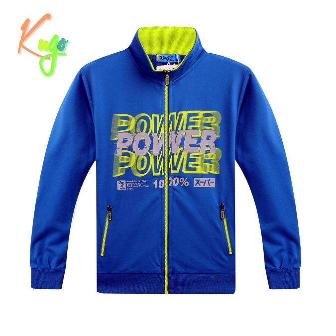 Chlapecká bavlněná mikina Kugo MM1625 s nápisem na předním dílu. Mikina má zapínání na zip, stojáček, rukávy a spodní díl mikiny jsou ukončené lemem.