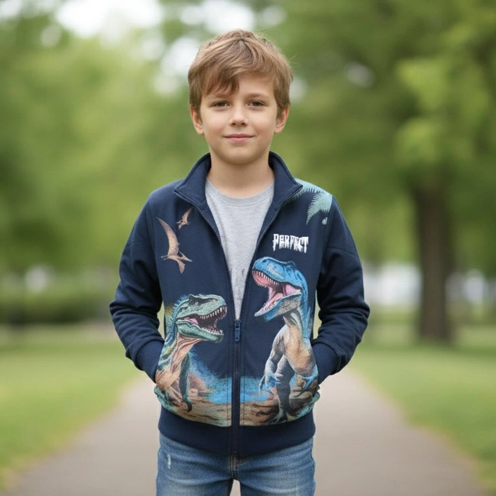 Chlapecká bavlněná mikina s obrázky od firmy Kugo pro všechny malé nadšence dinosaurů. Kvalitní mikina pro běžné nošení na ven nebo do školy a školky. Mikina Kugo pro kluky má stojáček a zapínínání na zip, v předu dvě kapsy na zip, rukávy a spodní část mikiny je ukončena do lemu.
