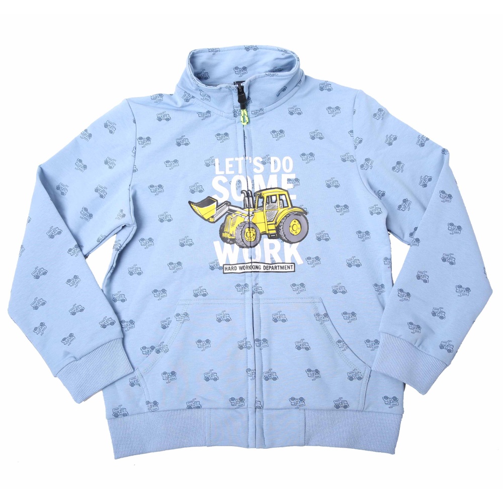 Bavlněná chlapecká mikina Wolf M2253 z jarní kolekce 2022. Mikina Wolf je vyrobena z příjemného materiálu, který nežmolkuje, na rubu mikiny je smyčka. Zapínání na zip až ke krku. V předu dvě funkční kapsy, na mikině je potisk malých nákladních aut, na předním dílu je velký obrázek bagru.