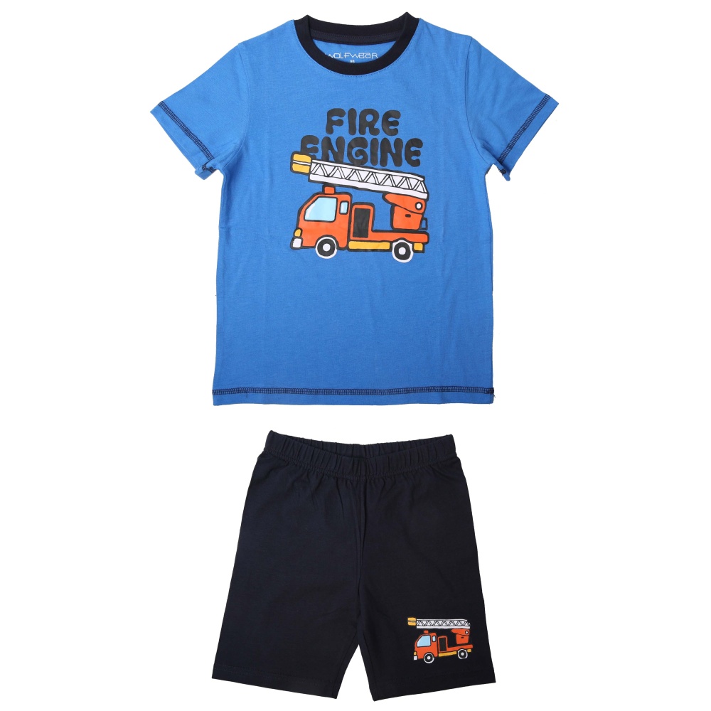 Krásné letní chlapecké pyžámko Wolf z kolekce jaro/léto 2022. Chlapecké pyžámko je vyrobené z příjemného a kvalitního materiálu. Pyžámko Wolf je možné také použít jako letní komplet na ven nebo na tělocvik. Na tričku je potisk, kraťasy jsou jednobarevné s potiskem bagrů.