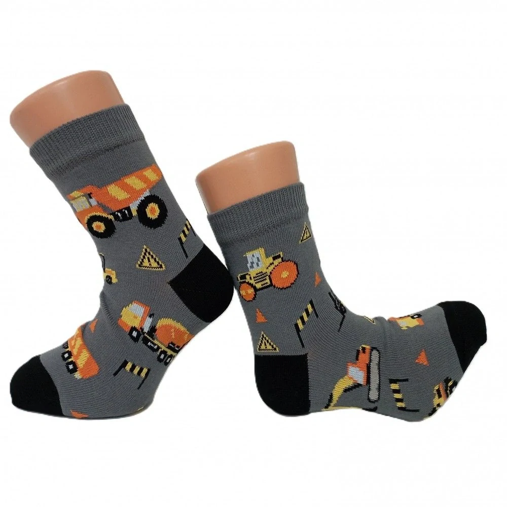 Ponožky Trepon pro malé děti s barevnými stavebními stroji jsou nejen pěkné na pohled, ale také jsou perfektně pohodlné Velice příjemné a pohodlné při nošení díky kvalitní dlouhovlákné bavlně a přidanému elastanu. Ponožky jsou prodyšné, velmi jemné a poskytují přirozené pohodlí. Paty a špice jsou zesíleny pro lepší odolnost prototi prošlapání. Extra plochý šev v oblasti prstů. Vhodné do volnočasové i sportovní obuvi.