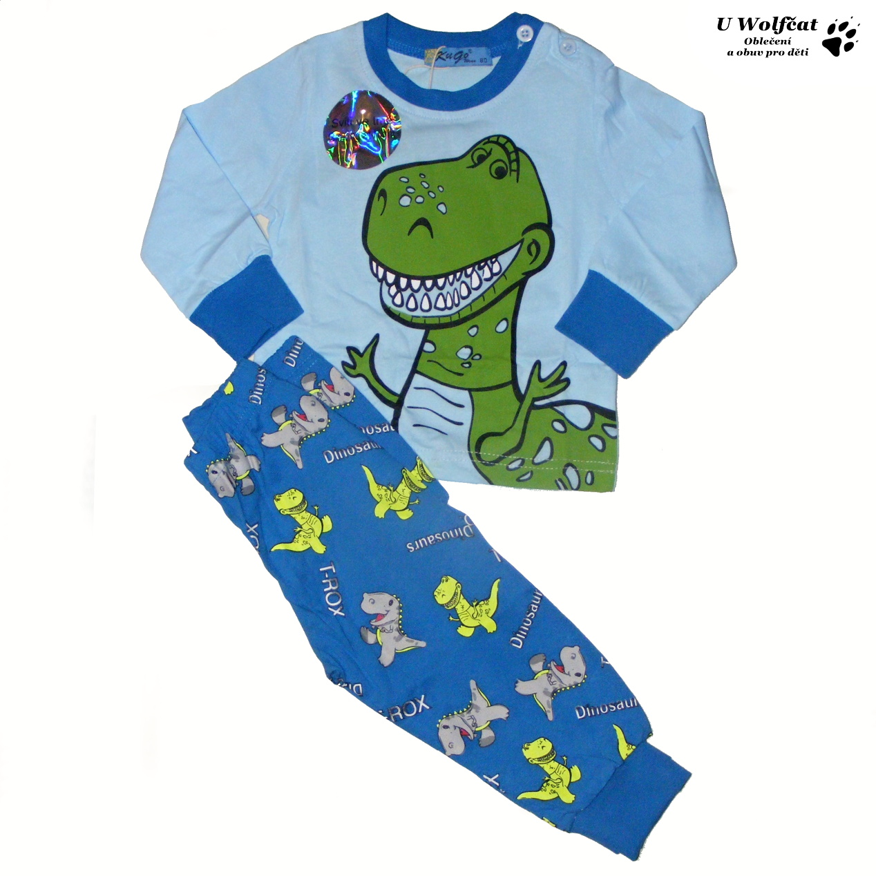Na tričku je velký obrázek dinosaura, nohavice jsou potištěné malými dinosaury a nápisy.