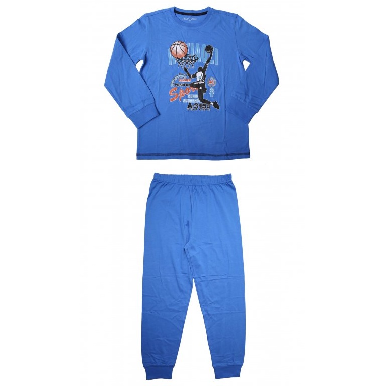 Krásné bavlněné junior pyžamo od firmy Wolf z kolekce podzim/zima 2022 pro kluky. Chlapecké pyžamo Wolf je vyrobeno z příjemného a pevného materiálu. Nohavice a rukávy jsou ukončené do lemu, v předu na triku je obrázek se sportovním motivem.
