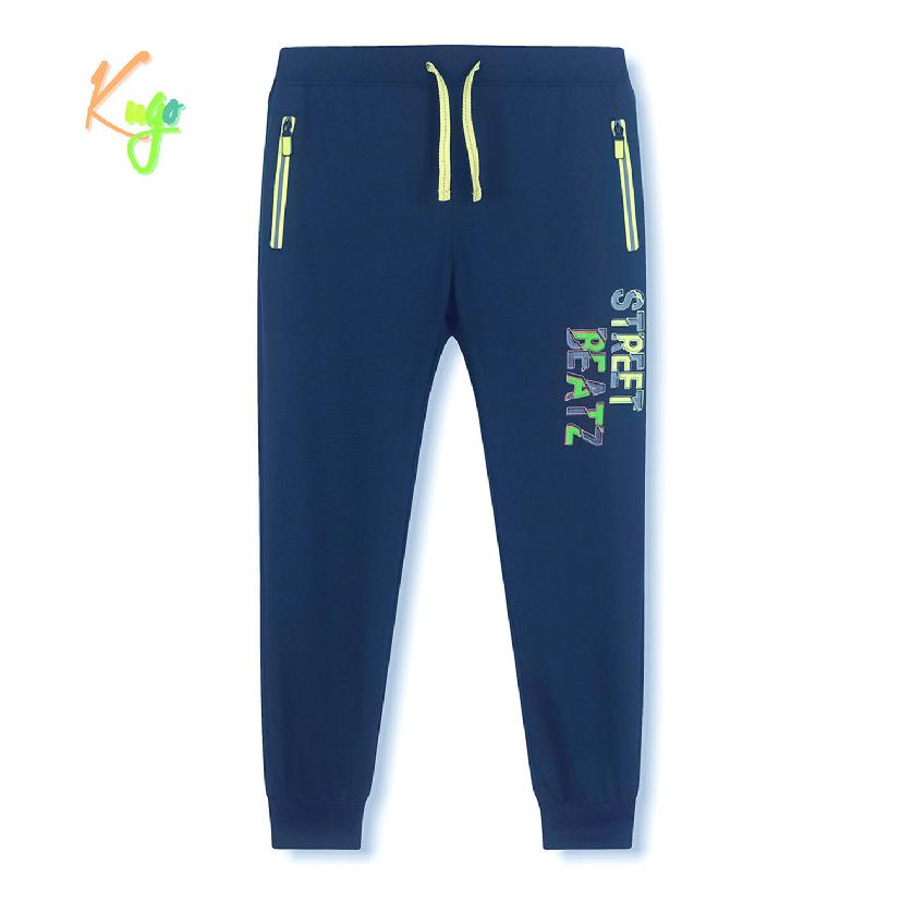 Chlapecké bavlněné tepláky Kugo v pase na gumu se šňůrkou na stažení, nohavice ukončené do lemu. Dvě kapsy se zapínáním na zip.