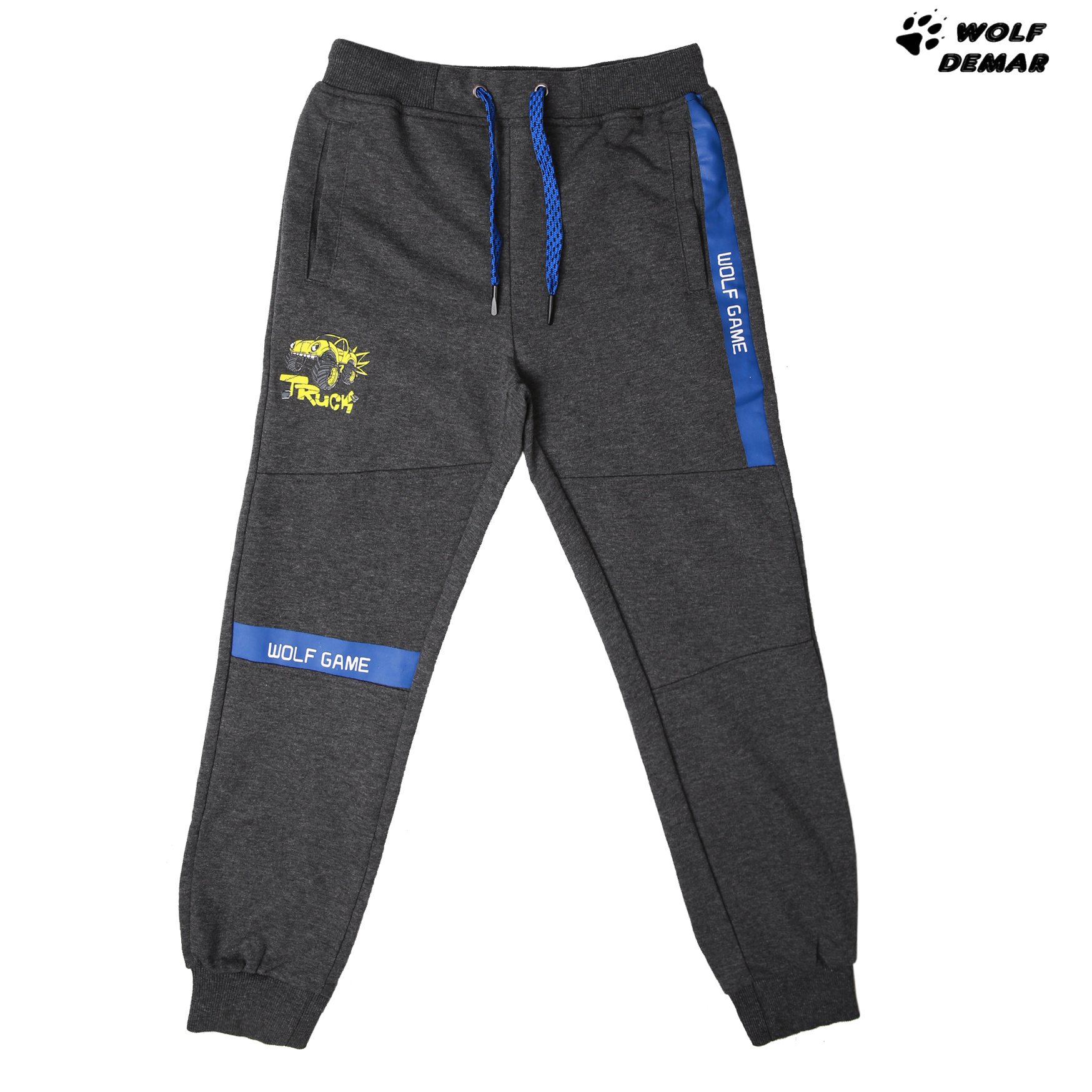 Krásné chlapecké tepláky Wolf ze zimní kolekce 2020 v pase na gumu, nohavice jsou ukončené lemem. Po strannách jsou dvě funkční kapsy. V pase je šňůrka na stažení. Vnitřní strana tepláků je bez chloupku - smyčky.