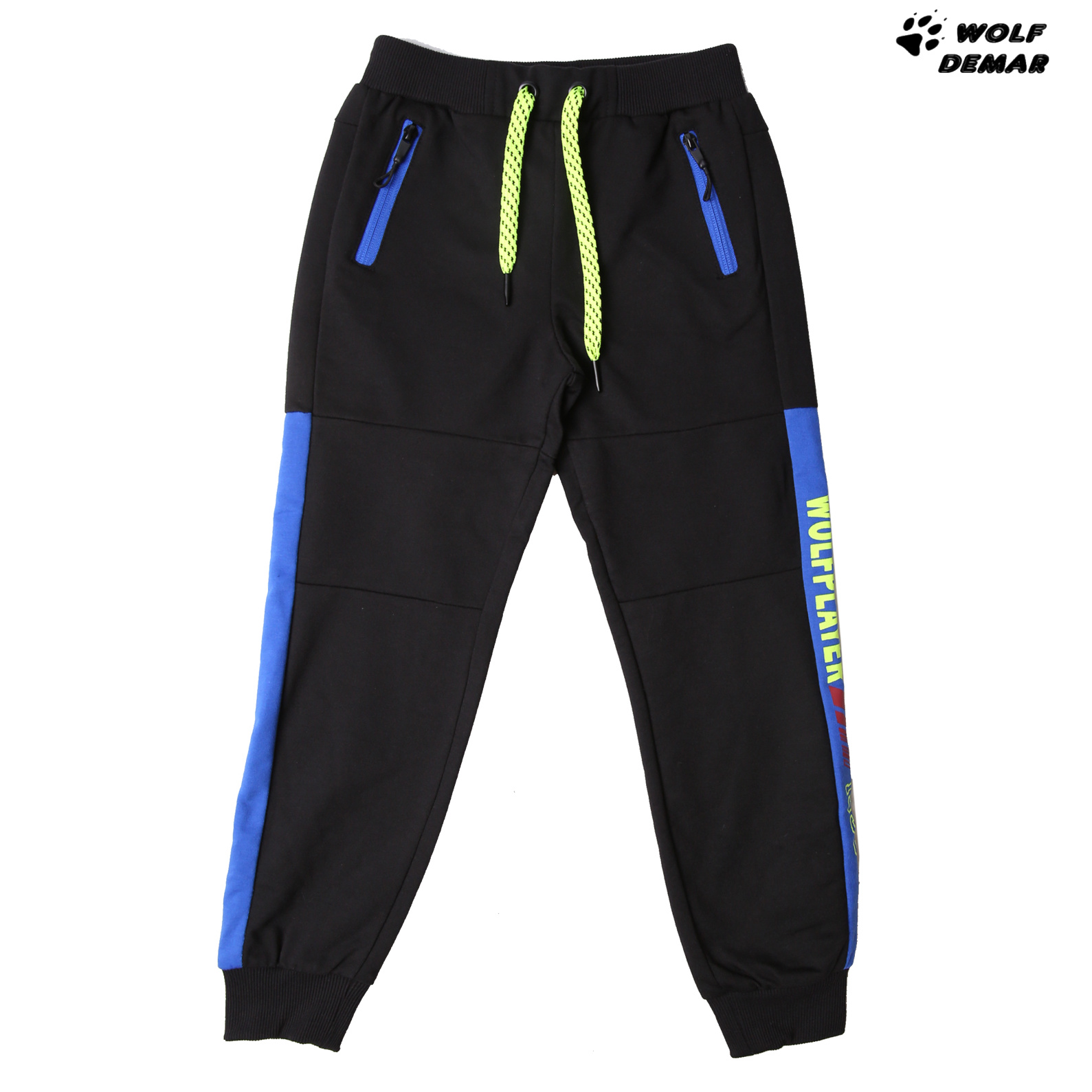 Krásné chlapecké tepláky Wolf z jarní kolekce 2021 v pase na gumu, nohavice jsou ukončené lemem. Po strannách jsou dvě funkční kapsy. V pase je šňůrka na stažení. Vnitřní strana tepláků je bez chloupku - smyčky.