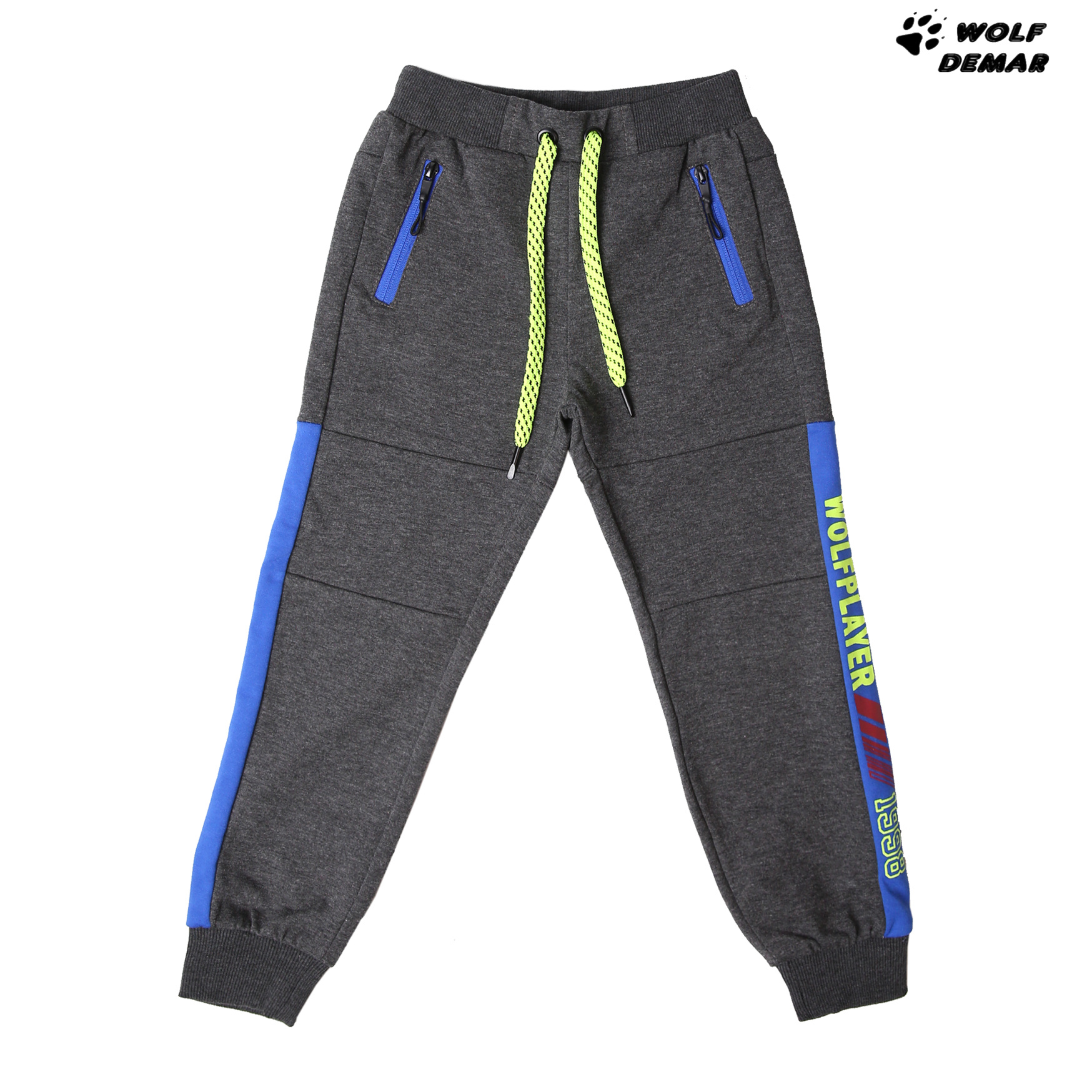 Krásné chlapecké tepláky Wolf z jarní kolekce 2021 v pase na gumu, nohavice jsou ukončené lemem. Po strannách jsou dvě funkční kapsy. V pase je šňůrka na stažení. Vnitřní strana tepláků je bez chloupku - smyčky.