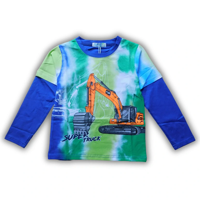 Bavlněné chlapecké tričko od firmy Kugo HC9308 s dlouhým rukávem a obrázkem bagra na předním dílu.  Tričko je vyrobeno z příjemného a kvalitního materiálu. Barvy jsou stálobarevné i po mnoha vypráních (máme vyzkoušené u nás doma).