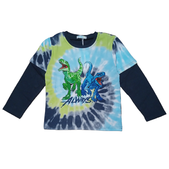 Bavlněné batikované chlapecké tričko s dlouhým rukávem značky Kugo s obrázky dinosaurů. Tričko je s dlouhým rukávem, vyrobeno z kvalitního bavlněného materiálu s příměsí elastanu pro zachování tvaru při praní. Tričko má dvojitý rukáv.