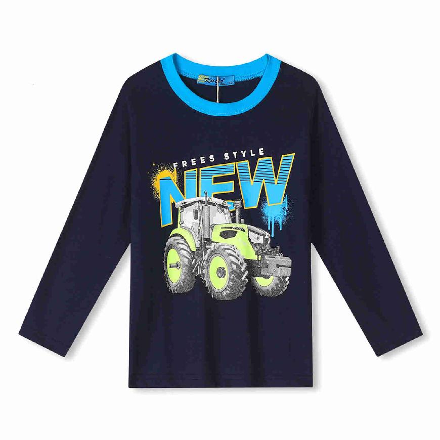Bavlněné chlapecké tričko s dlouhým rukávem od firmy KUGO MC3789 v tmavě modré barvě. Na předním dílu trička je obrázek s traktorem. Tričko je vyrobeno z příjemného a kvalitního materiálu. Barvy jsou stálobarevné i po mnoha vypráních ( máme vyzkoušené u nás doma ).