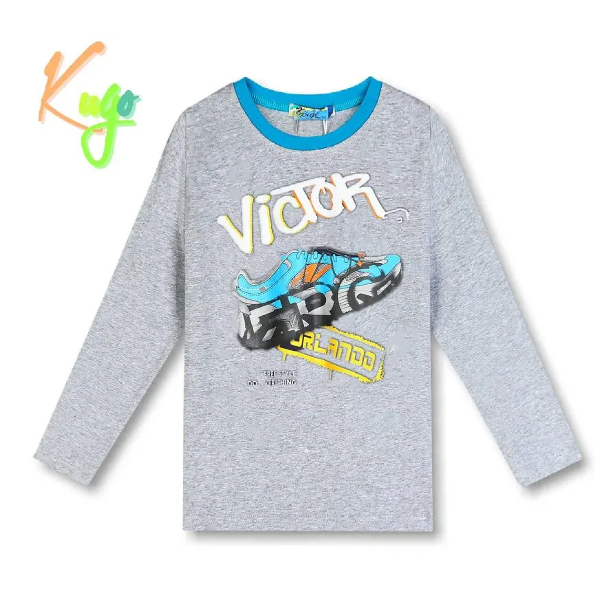 Moderní tričko pro kluky od firmy Kugo s dlouhým rukávem, na předním dílu jsou nápisy a brázek tenisky. Tričko je vyrobeno z příjemného a kvalitního materiálu. Barvy jsou stálobarevné i po mnoha vypráních (máme vyzkoušené u nás doma).
