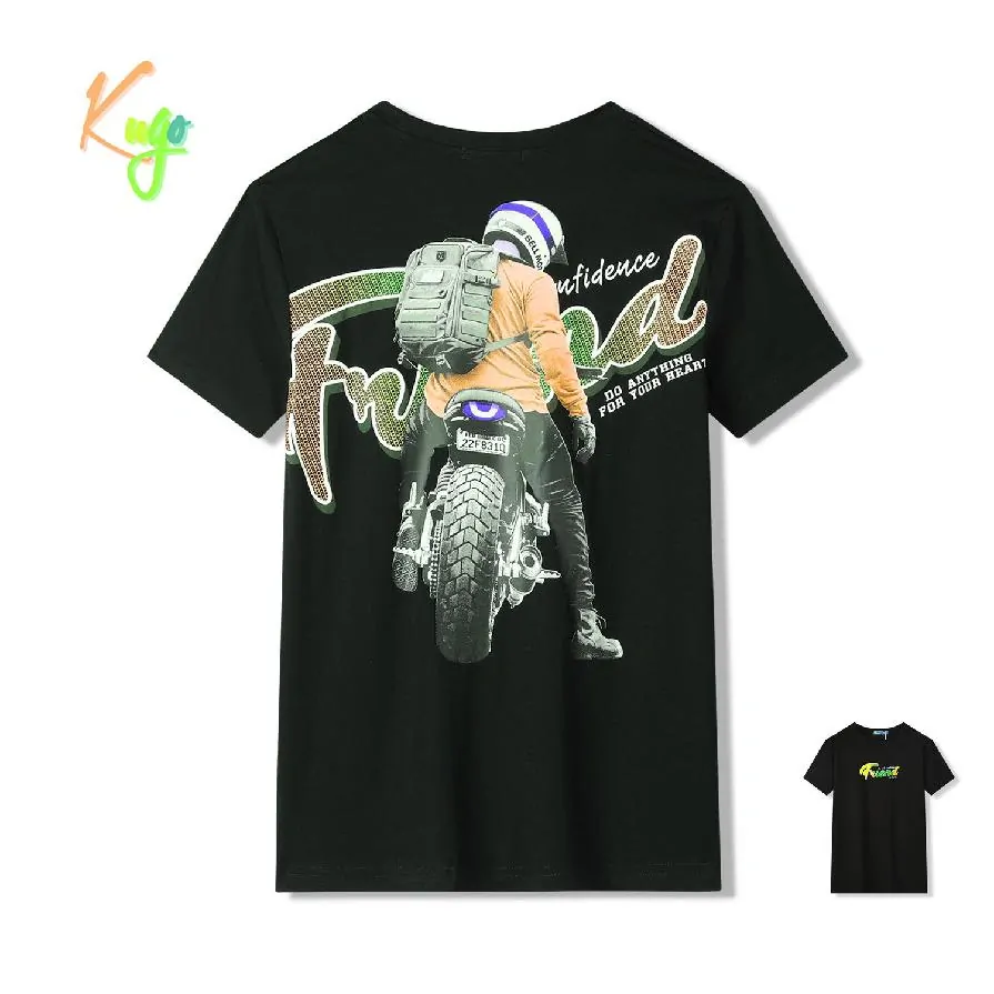Jednobarevné moderní chlapecké tričko Kugo s krátkým rukávem a nápisem na předním dílu a velkým obrázkem motorky na zádech. Tričko je vyrobeno z kvalitního bavlněného materiálu.
