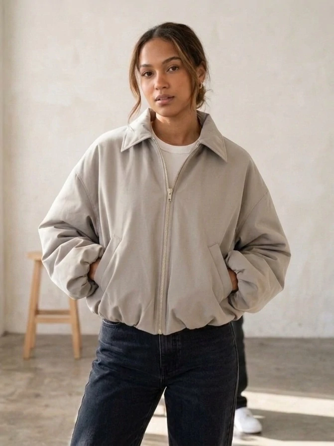 Kabátek má krátký střih s volnějším oversize tvarem, který lichotí postavě a současně poskytuje volnost pohybu. Balónové rukávy dodávají originální šmrnc a umocňují trendy look. Díky jemnému materiálu se bunda příjemně nosí a přizpůsobí se tvarům těla, zatímco praktický zip a kapsy vám usnadní každodenní nošení.
