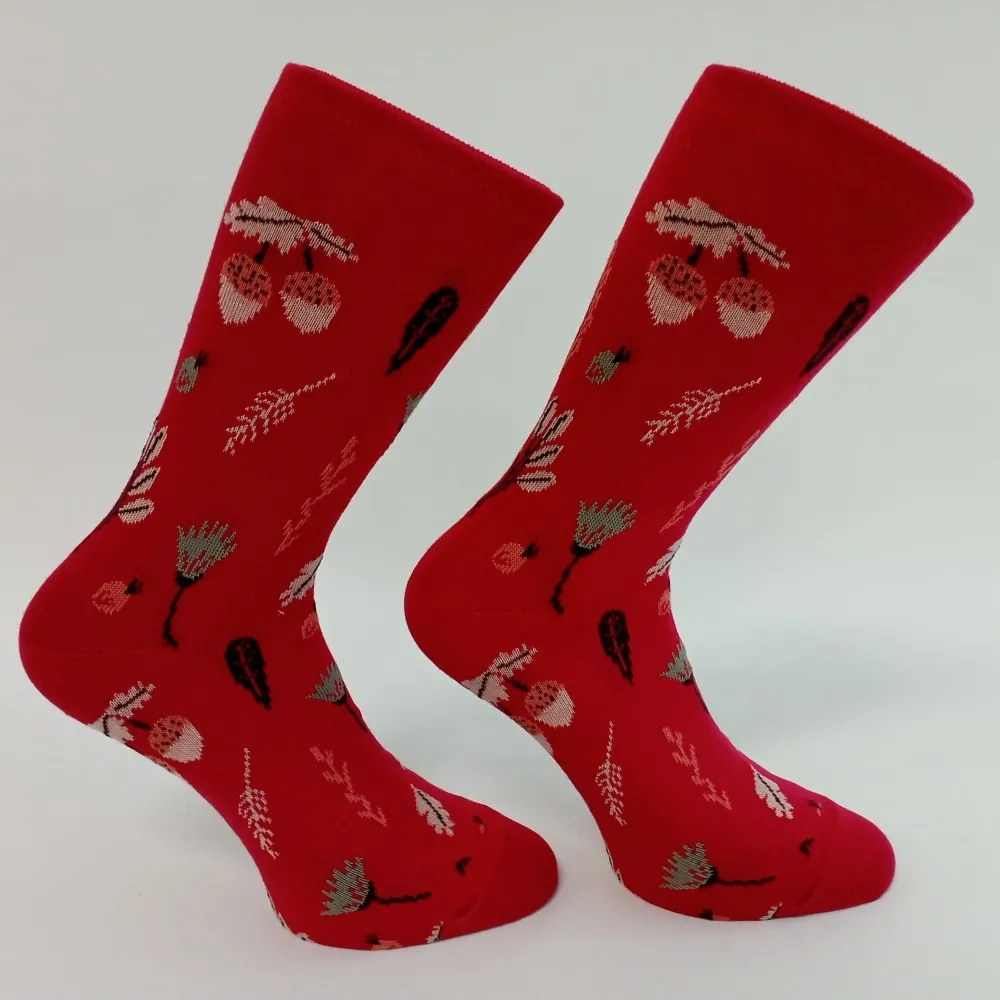 Barevné dámské ponožky s lesním motivem. Tyto ponožky jsou upleteny z kvalitní dlouhovlákné bavlny, pro tvarovou stabilitu je v lýtku a chodidlu přidán elastan. Zátěžové zóny - pata a špice jsou zesíleny. Špičky jsou uzavřeny plochým stehem a lem ponožek je jemný, jednoduchý, ukončený ruličkou.