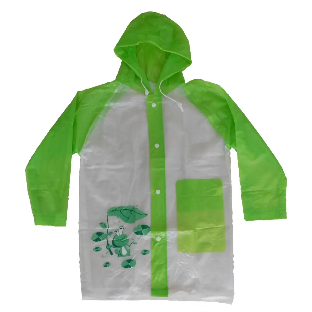 Barva pláštěnky je transpatentní se zelenými rukávy a kapucí.