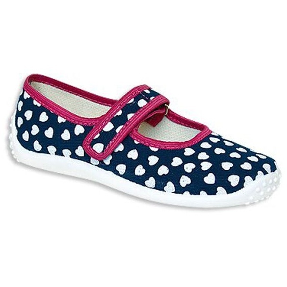 Dětská dívčí textilní obuv Bighorn JITKA v tmavě modré barvě s bílými srdíčky se zapínáním na suchý zip. Materiál je vysoce kvalitní bavlna. Lehká pružná podešev vyrobená z PVC. Stélka je vyrobena z přírodní kůže a pružné pěny s aktivním uhlím. Kůže absorbuje přebytečnou vlhkost a aktivní uhlí nepříjemné pachy, což chodidlu dává pocit svěžesti. Pata obuvi je vyztužena. Bota je velice pohodlná a lehká. Obuv je vyrobena v EU.