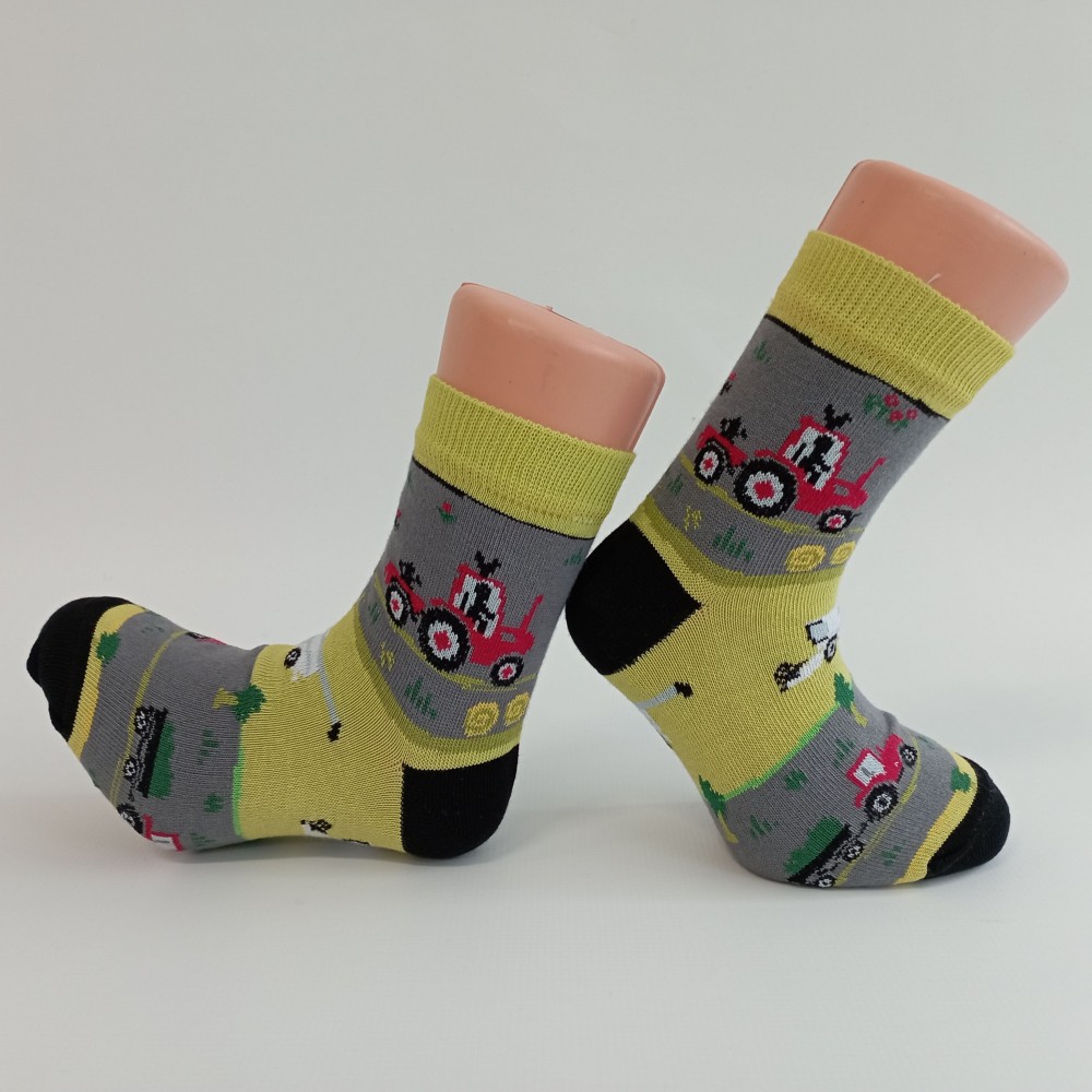 Ponožky Trepon pro všechny malé i velké milovníky farmaření, traktorů a zvířat. S těmito ponožkami bude veselejší a zaručeně zpříjemější každý den malého zemědělce nebo traktoristy. Jsou vyrobeny z jemné bavlny a díky přidanému elastanu se skvěle přizpůsobí tvaru dětské nohy. Ponožky mají komfortní lemy, které se nezařezávají. Špička a pata ponožek jsou zesílené.