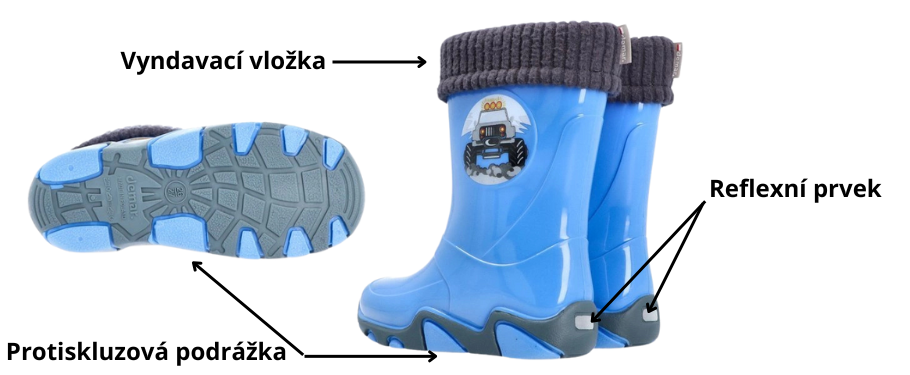 Tyto holínky jsou ideální pro děti do školky, zahradu nebo na lesní dobrodružství. Holínky májí hrubší protiskluzovou podrážku zajišťující bezpečnost chůze, jsou velice pohodlné a lehké. Materiál je vysoce kvalitní PVC podšité příjemnou textilií. Na patě obuvi je bezpečnostní reflexní pásek pro dobrou viditelnost dítěte ve tmě.