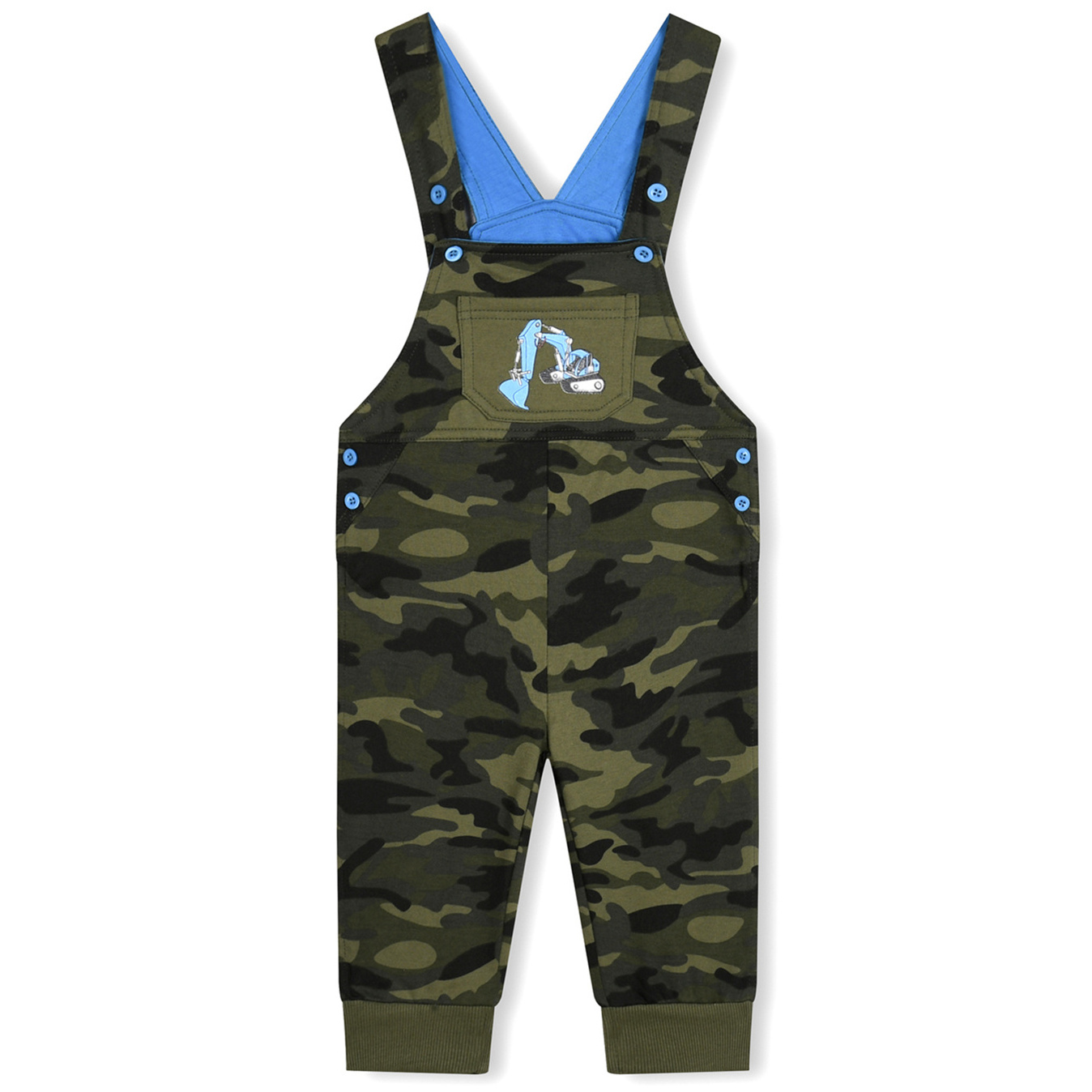 Krásné dětské maskáčové tepláky s laclem, tzv. "zahradníčky", pro malé prcky od firmy Kugo s obrázky na laclu - bagr pro kluky a jednorožec pro holky. Tepláky mají v předu kapsičku, zapínání na knoflíky, nohavice jsou ukončené do lemu.