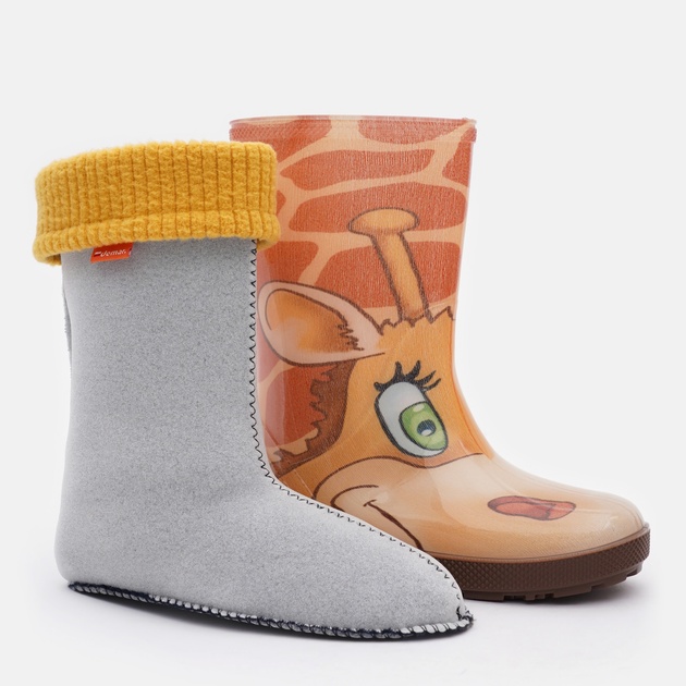 Barevné provedení: Barva holínek je žluto-hnědá stylově doplněna o obrázek žirafy. Lem vložky je ve žluté barvě.