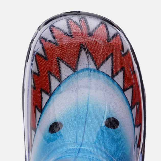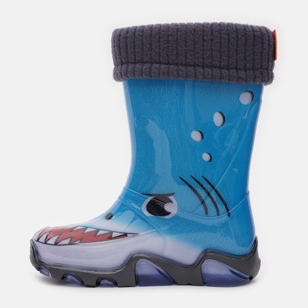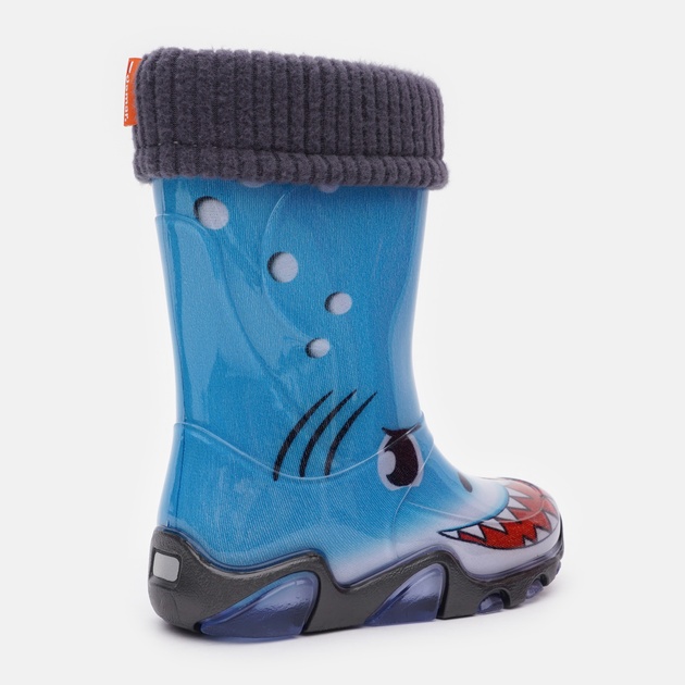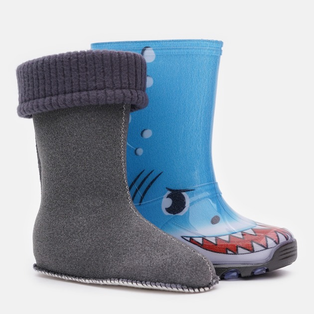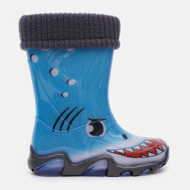 Barevné provedení: Barva holínek je modro-šedá stylově doplněna o obrázek žraloka. Lem vložky je v tmvě šedé barvě.