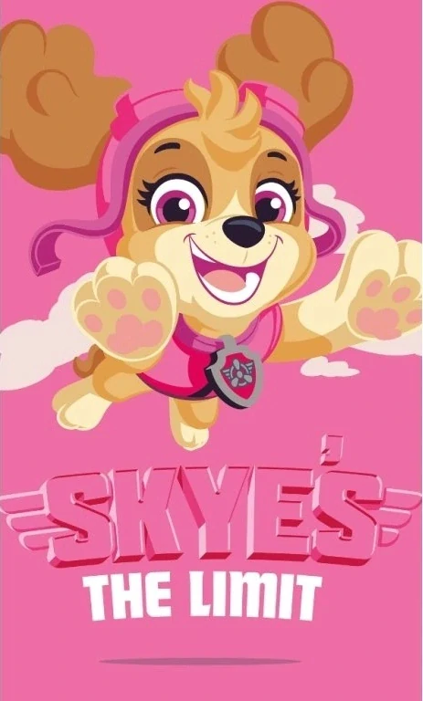 Na růžové ručníčku je rozkošná fenečka Skye z oblíbené animované pohádky Paw Patrol. Skye má na zádech svůj jetpack díky kterého může doletět kamkoli, třeba rovnou i do oblak.