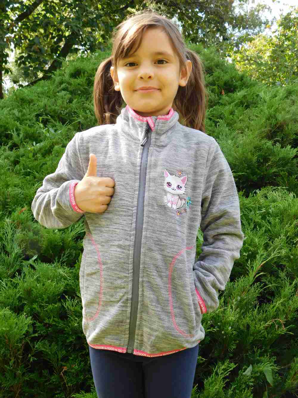 Mikina má zapínání na zip až ke stojáčku, takže pěkně chrání krk před větrem. Na předním dílu ji zdobí jemně vyšívaný obrázek roztomilé kočičky s kytičkami, který si malé slečny zamilují na první pohled. Dvě přední kapsy bez zipu poslouží na ruce i malé poklady z cest.
