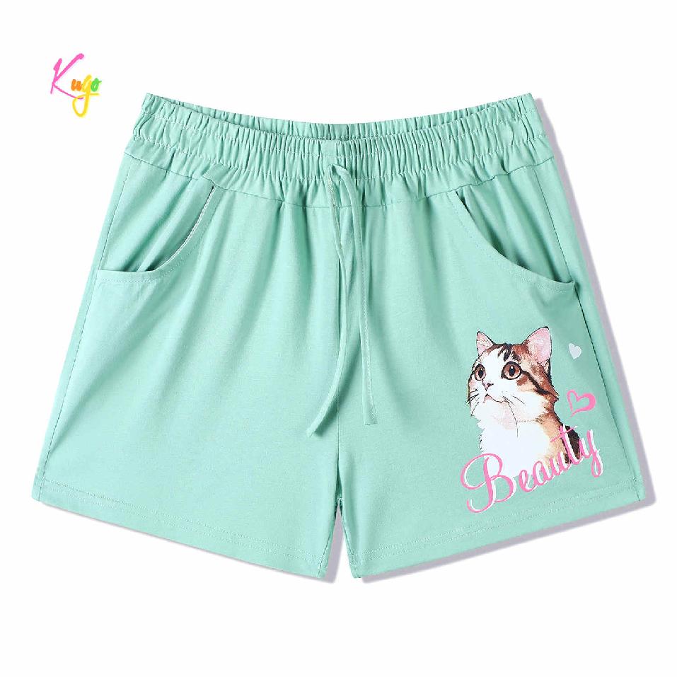 Dívčí bavlněné kraťasy Kugo v pase na širokou gumu a obrázky. Kraťasy jsou olemované. Kraťasy jsou vyrobený z příjemného bavlněného materiálu vhodného na tělocvik nebo letní teplé dny.