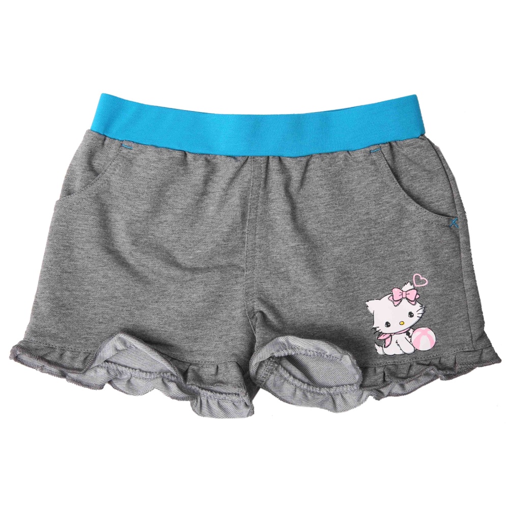Kraťasy mají v pase širokou gumu, v letošní kolekci chybí šňůrka na stažení. A samozřejmě dvě funkční kapsy vpředu. Na nohavici je obrázek kočičky.