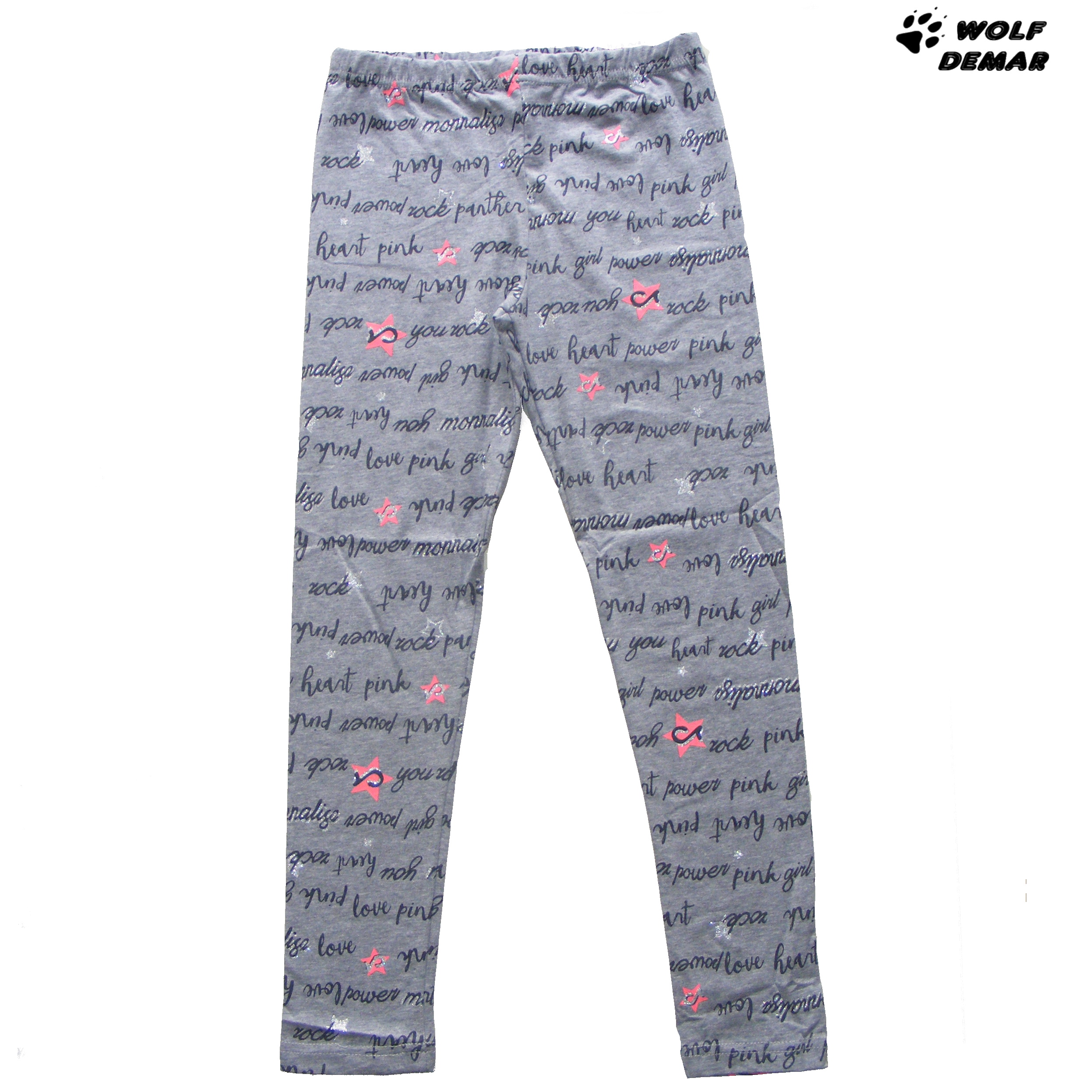 Krásné dívčí elastické legíny od fi Wolf z kolekce jaro/léto 2021. Legíny Kugo jsou vyrobené z příjemného a kvalitního materiálu. Legíny Kugo jsou vhodné na cvičení, místo punčocháčů nebo na běžné nošení. Legíny jsou celé potištěné nápisy a znaky.