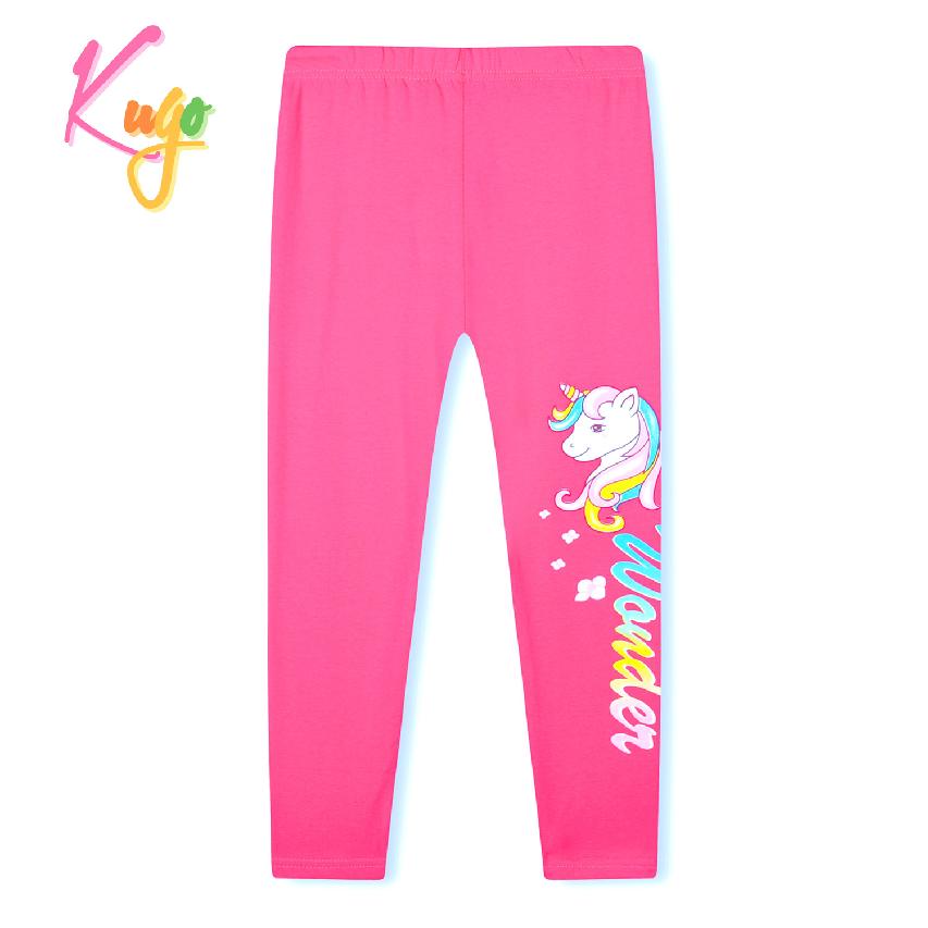 Dívčí dlouhé legíny Kugo s obrázkem na nohavici. Legíny jsou v pase do gumy, jsou jednobarevné, na jedné nohavici je nažehlený obrázek. Legíny pro dívky jsou vyrobené z kvalitního bavlněného materiálu s příměsí elastanu.