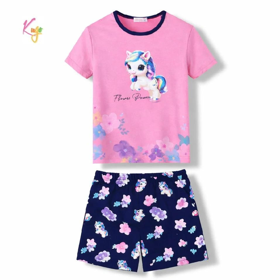 Představujeme další krásné dívčí letní pyžámko KUGO s poníkem a květinami. Jednobarevné tričko s obrázkem na předním dílu doplňují jednobarevné kraťasy s potiskem. Pyžámko je vyrobeno z bavlněného příjemného materiálu, vhodného na teplé letní dny. Tričko je volného střihu, kraťasy jsou v pase do gumy (guma je všitá).