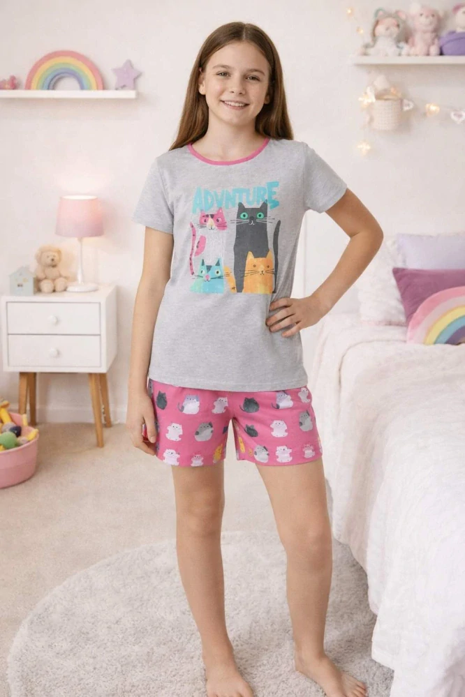 Dívčí krátké pyžmo nebo letní komplet Kugo pro teplé dny. Souprava je vyrobena z bavlněného příjemného materiálu. Tričko je volného střihu, kraťasy jsou v pase do gumy (guma je všitá). Na předním dílu trička je velký obrázek s kočkami, kraťasy jsou s obrázky kočiček.