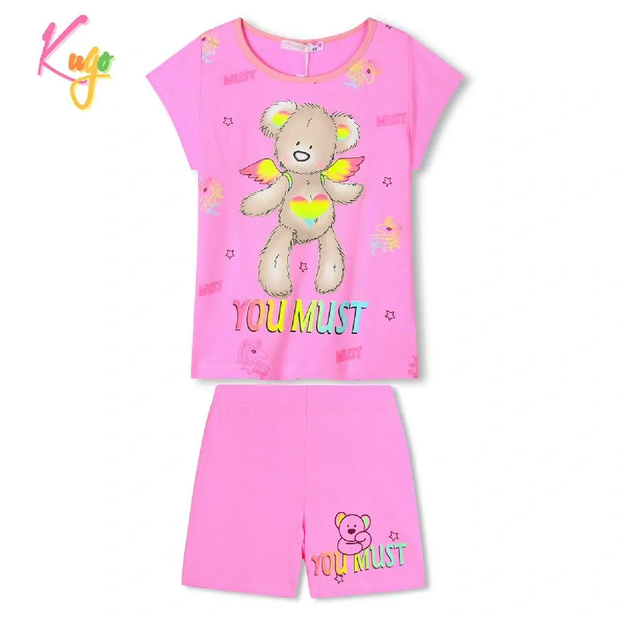 Dívčí letní pyžámko nebo letní komplet Kugo pro teplé letní dny. Souprava je vyrobena z bavlněného příjemného materiálu. Tričko je volného střihu, kraťasy jsou v pase do gumy (guma je všitá). Tričko jednobarevné, na předním dílu trička je velký obrázek medvídka, kraťasy jsou jednobarevné s malým medvídkem na levé nohavici.