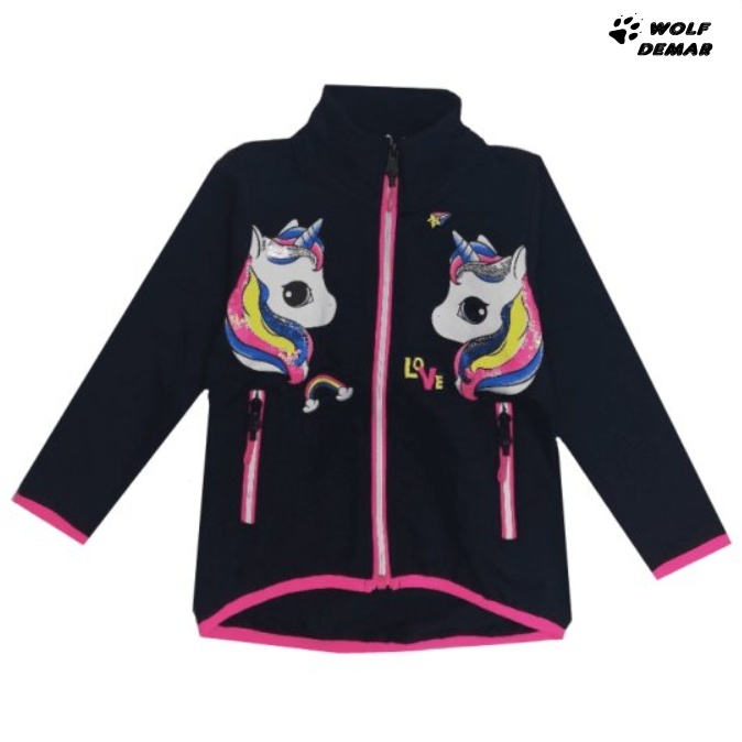 Krásná dívčí mikina KUGO s obrázkem jednorožce a nápisy. Mikina má zapínání na zip, stojáček, v předu dvě kapsy se zapínáním na zip. Rukávy a spodní díl mikiny jsou ukončené lemem.