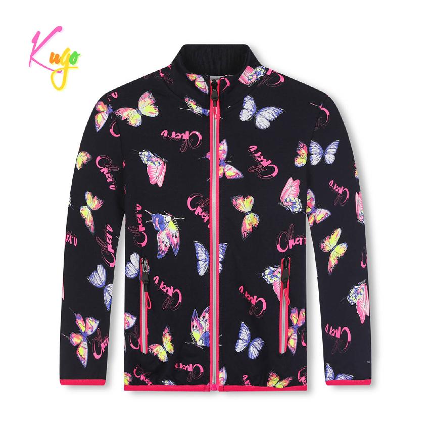 Krásná dívčí mikina značky Kugo s obrázky motýlů. Mikina má zapínání na zip, stojáček, v předu dvě kapsy se zapínáním na zip. Rukávy, spodní díl a zip mikiny jsou obšité tmavě růžovou lemovkou. Mikina je vyrobena z kvalitního bavlněného materiálu s příměsí 5% elastanu.