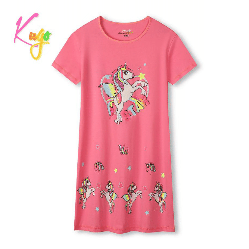 Krásná dívčí noční košilka s krátkým rukávem od firmy KUGO MN1766 s obrázkem jednorožce. Noční košilka Kugo je vyrobena z příjemného a kvalitního bavlněného materiálu. Obrázek na předním dílu - jednorožec s křídly.