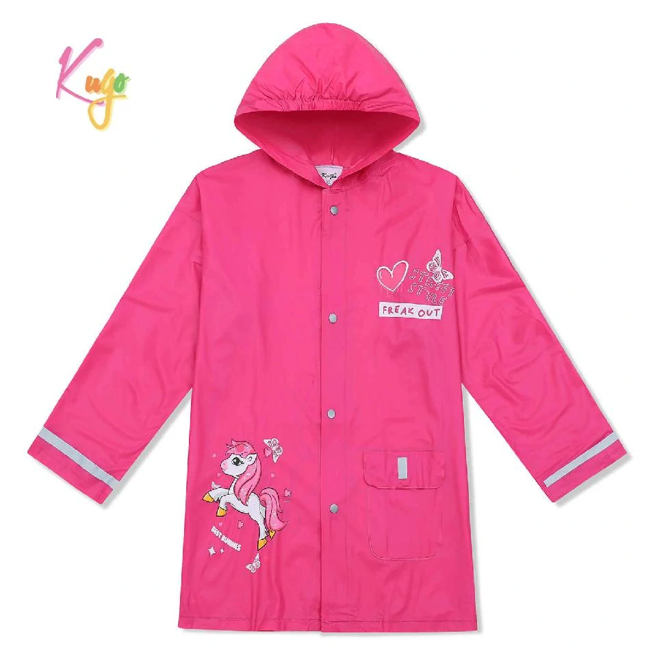 Stylová růžová pláštěnka pro holky značky Kugo zaujme veselým potiskem jednorožce s nápisem „BEST BUNNIES“ na přední i zadní straně. Horní část zdobí nápisy „FREAK OUT“, srdíčko a motýlek. Pláštěnka je vyrobena z lehkého nepromokavého materiálu, má kapuci, zapínání na patentky a praktickou kapsu vpředu. Reflexní prvky na rukávech zvyšují bezpečnost za šera.