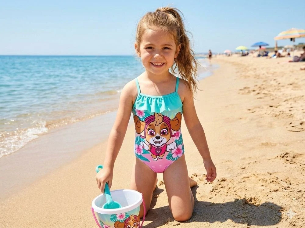Jednodílné plavky pro dívky s volánkem se Skye z Tlapkové patroly od výrobce E plus M. Dívčí plavky s veselým obrázkem na předním dílu, elegantní volánky okolo okolo výstřihu. Z vnitřní strany spodního dílu je jemná bílá hygienická podšívka. Materiál plavek je poměrně elastický, takže se dobře přizpůsobí tělu, snadno se oblékají a pohodlně se nosí.