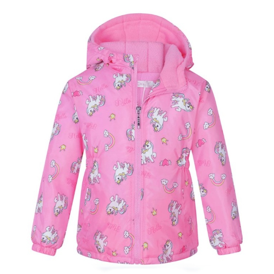 Dívčí podzimní šusťáková bunda s fleecovou podšívkou pro chladné podzimní dny. Bunda má kapucu, zapínání na zip až ke krku, u krku kryt zipu. Kapuca je napevno přišitá k bundě (nejde odepnout).