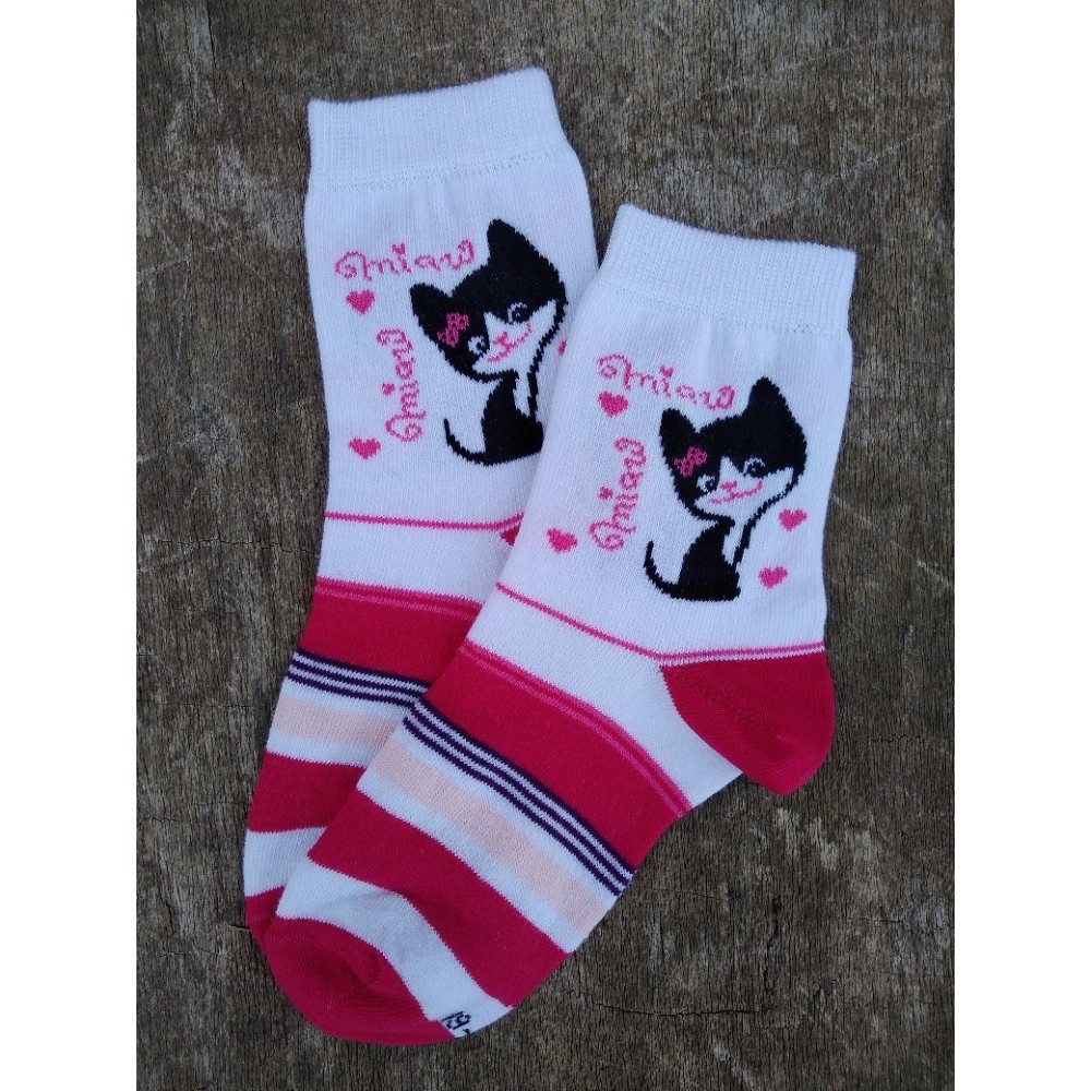 Dívčí ponožky Trepon s kočičkou. Originalita, pohodlí, styl. Kousek s nápaditým vzorem, který stojí za oživení dětského outfitu. Jsou vyrobeny z jemné bavlny a díky přidanému elastanu se skvěle přizpůsobí tvaru dětské nohy. Ponožky mají komfortní lemy, které se nezařezávají. Špička a pata ponožek jsou zesílené.