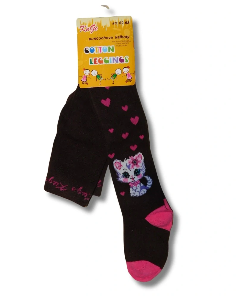 Tyhle dívčí punčocháče Kugo si zamiluje každá malá milovnice roztomilých zvířátek – a její rodiče taky! Stylová hnědá barva se sytě růžovými detaily a roztomilou kočičkou obklopenou srdíčky z nich dělají ideální volbu pro každodenní nošení i slavnostnější chvilky.