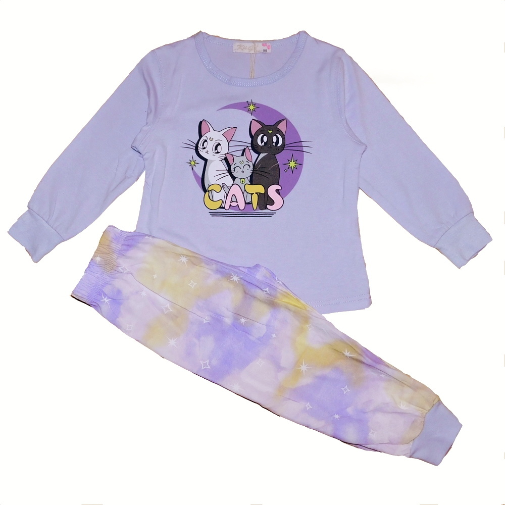 Krásné dívčí pyžamo KUGO s kočičkami na předním dílu je vyrobeno z bavlněného materiálu, příjemného na dotek. Rukávy i nohavice pyžama jsou zakončené do praktického patentu, v pase všitá guma.
