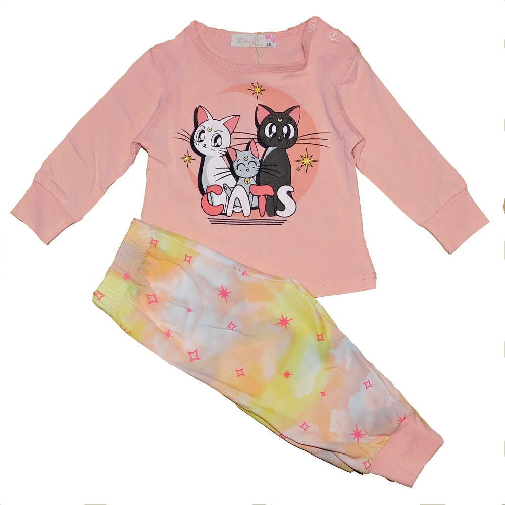 Na tričku je velký obrázek koček, nohavice jsou duhové s potiskem hvězdiček. Tričko má od velikosti 80 do velikosti 92 na rameni knoflíčky pro lepší převlíkání přes hlavu, od velikosti 98 je tričko bez knoflíků.
