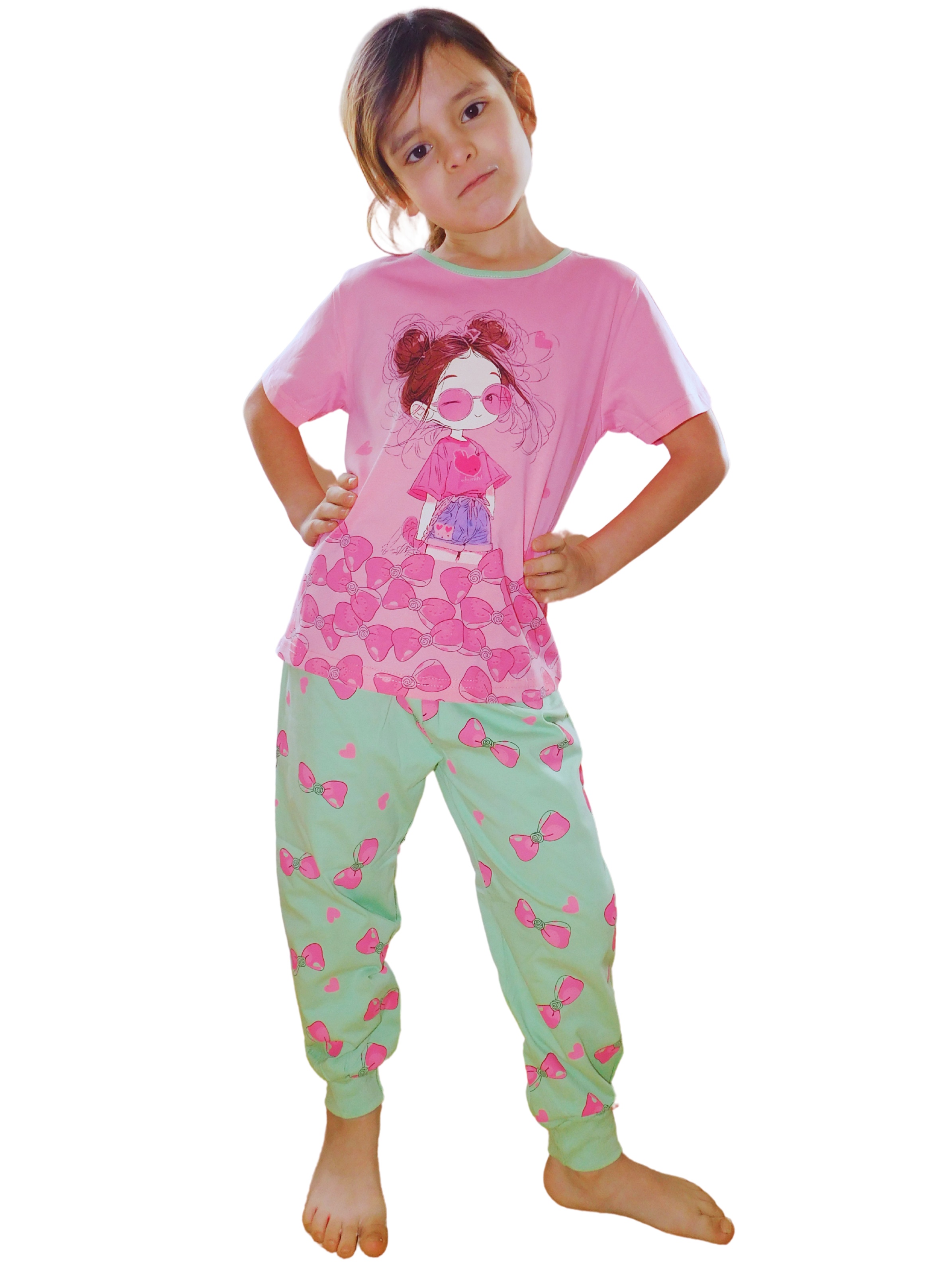Pyžamo se skládá z trička s krátkým rukávem a dlouhých kalhot, což je ideální kombinace pro dívčí pyžama s krátkým rukávem. Tričko je ozdobeno roztomilým obrázkem holčičky, u jejíchž nohou jsou mašle, což dodává celému pyžamu hravý a atraktivní vzhled. Dlouhé kalhoty mají potisk mašlí, který perfektně doplňuje vzhled trička. Kalhoty jsou navíc v pase opatřeny všitou gumou pro pohodlné nošení a nohavice jsou zakončeny do lemu, což přidává na komfortu i stylu.