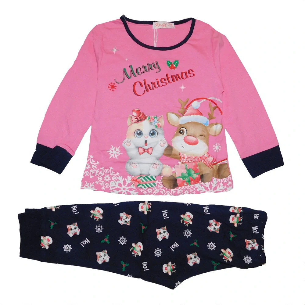 Dětské dívčí pyžamo ze 100% bavlny s Vánočním motivem od značky KUGO. Rukávy a nohavice pyžama jsou zakončeny do lemu. Na triku nažehlený obrázek, kalhoty jsou jednobarevné s potiskem. Vánoční pyžamo pro dívky je vyrobeno z příjemného a kvalitního bavlněného materiálu.